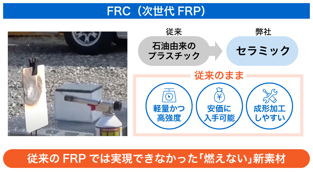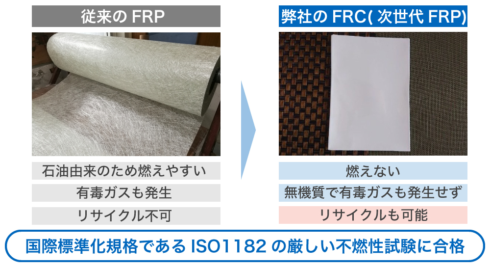 æ¬åœã«çããªãFRPã®éçºã¯ãFRPæ¥çã®é·å¹Žã®èª²é¡ã§ããããããªäžãåŒç€Ÿãéçºããæ¬¡äžä»£ã®FRPã§ãããFRCïŒç¹ç¶åŒ·åã»ã©ããã¯ïŒãã¯åäŸã®ãªãæš¹èåéã®çŽ æãšããŠãåœéèŠæ Œã§ããISO1182ã®å³ããäžçæ§è©Šéšã«å§åçæ°å€ã§åæ ŒããŸãããåŸæ¥ã®ãã©ã¹ããã¯çŽ æã§ããFRPãšã¯ç°ãªããç¡æ©è³ªã§ææ¯ã¬ã¹ãçºçããããªãµã€ã¯ã«ãå¯èœãªå°çç°å¢ã«åªããçŽ æã§ãã