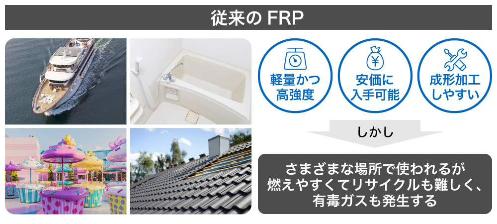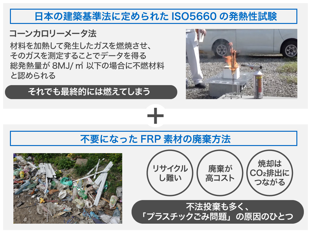 ããããFRPã¯ç³æ²¹ç±æ¥ã®ãã©ã¹ããã¯ã§ããããããçããããã®ãé·å¹Žã®èª²é¡ã§ããæ¥æ¬ã®å»ºç¯åºæºæ³ã«å®ããããISO5660ã®çºç±æ§è©Šéšã«åæ ŒããäžçFRPã§ãããçãã«ãããã®ãç²Ÿäžæ¯ã§ãããå Žåã«ãã£ãŠã¯çºç«ãææ¯ã¬ã¹ãçºçããŸããããã«ãFRPã¯æååè§£ãã¥ãããããªãµã€ã¯ã«ãé£ããã髿ž©çŒåŽããã°CO2ã®æåºã«ãã€ãªããã廿£åŠçã³ã¹ãã幎ã äžãã£ãŠããŠããŸããFRPã䜿ã£ãè¹è¶ãéšåãªã©ã®äžæ³ææ£ãå€ããäžççãªããã©ã¹ããã¯ãã¿åé¡ãã®åå ã®ã²ãšã€ã«ããªã£ãŠããŸãã