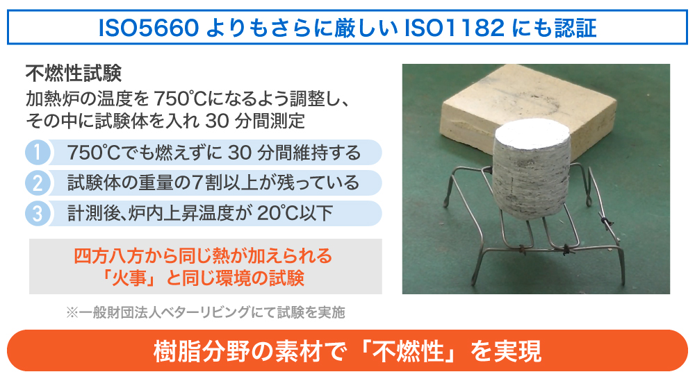 FRCã®é«ãäžçæ§ã¯ã補åã®çºç±æ§ãèŠå®ããåœéèŠæ ŒISO5660ã®èªèšŒååŸã¯ãã¡ãããISO5660ãããããã«å³ããäžçæ§ãèŠå®ããISO1182ã«ãèªèšŒãããŸãããåäŸã®ãªãæš¹èåéã®çŽ æã§ISO1182ã®åºæºãæºãããŠãããç«çœãšåããããªç°å¢äžã«ãèããããŸãã