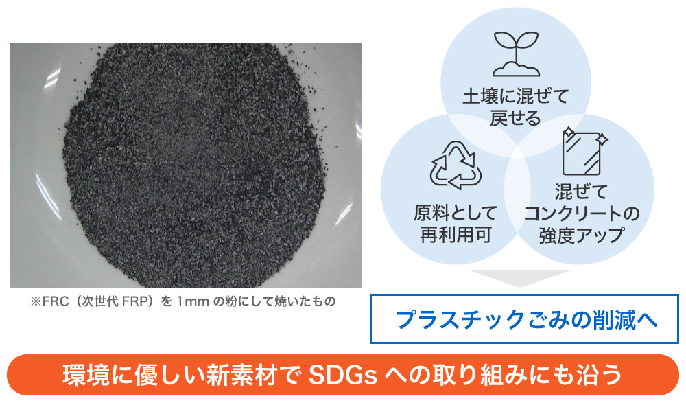 FRCã¯èªç¶ã«è¿ãã»ã©ããã¯ãåæãšããŠãããããç°å¢ã«åªããçŽ æã§ããããšãç¹åŸŽã§ããåŸæ¥ã®ãã©ã¹ããã¯åæã®FRPã¯ãæååè§£ãã¥ãããªãµã€ã¯ã«ãå°é£ã§ããããããã»ã©ããã¯åæã®FRCã¯ãç°¡åã«ç²ã«ããŠãªãµã€ã¯ã«ããããšãã§ããŸããåå£ã«æ··ããŠæ»ãããšãã§ããåæãšããŠåå©çšããããšãå¯èœã§ãããããã«ã¯ã»ã¡ã³ãã®ææãšããŠã³ã³ã¯ãªãŒãã®åŒ·åºŠã¢ããã«ã掻çšããããšãã§ããŸãã