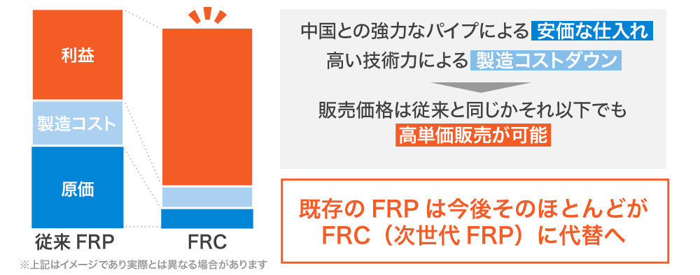 ããã«ãFRCã¯ãçããªãFRPããšããä»å 䟡å€ãåãã補åã§ãããç«¶åã®å°ãªãå§åçåªäœãªåžå Žã®ããã売å€ã¯åŒç€Ÿãåç¬ãã€åŒ·æ°ã«èšå®ã§ããŸããããã«ããé«ãå©ççã確ä¿ããªããããè²©å£²äŸ¡æ Œã¯åŸæ¥ã®FRPåçãå°ãäœãçšåºŠã«èšå®ããããšã§ãæ¢åã®FRPã¯ä»åŸãã®ã»ãšãã©ãåŒç€Ÿã®FRCïŒæ¬¡äžä»£FRPïŒã«ä»£æ¿ãããŠãããšèããŠããŸãã