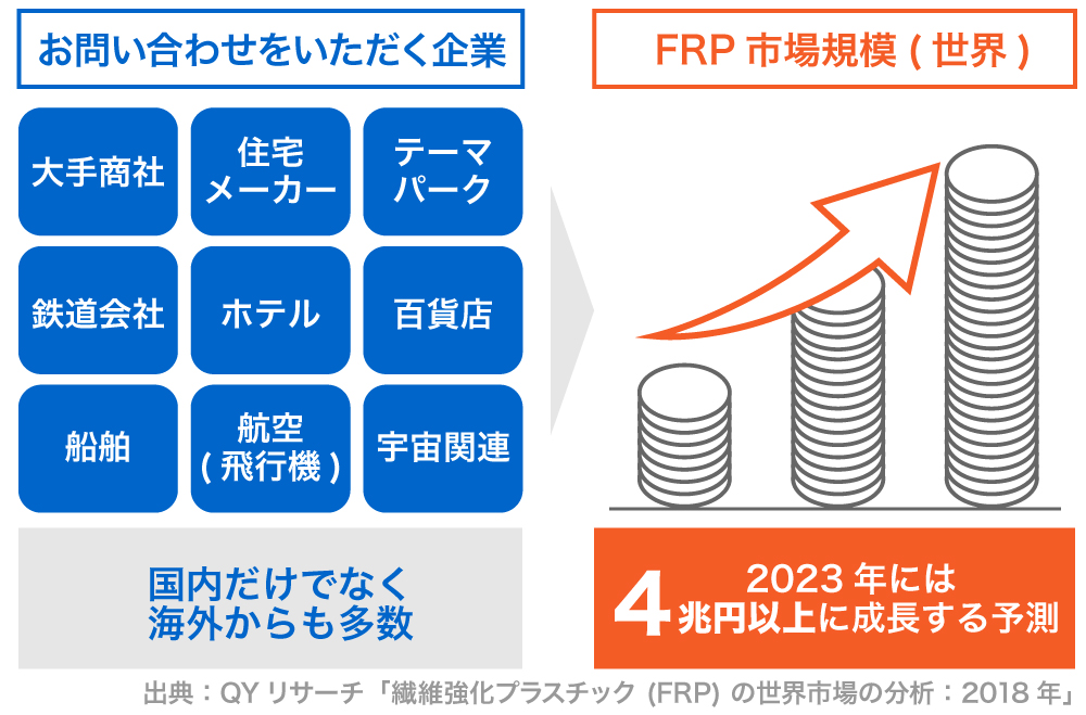 ãã§ã«æ¥æ¬ã®å€§æäŒæ¥ããæµ·å€ã®äŒæ¥ãŸã§æ°å€ãã®ãåãåãããããã ããŠããã代çåºå¥çŽã®åœ¢ãåããªããããããäžæ°ã«äºæ¥èŠæš¡ãæ¡å€§ãããŠããèšç»ã§ããäžçäžã®è³ããšããã§äœ¿ãããŠããFRPããåŒç€Ÿã®ãçããªããFRCã«çœ®ãæããããšã§ãå€ãã®å»ºç©ã人åœãç«çœããå®ãããšã«è²¢ç®ããŠãããããšèããŠããŸããåŒç€Ÿã¯ã売ãããšãæ£çŸ©ããšèãããã®é©æ°çãªæ°çŽ æãäžçã«æµéãããããå®å¿å®å šãªäžçã®å®çŸãç®æããŠãããŸãã