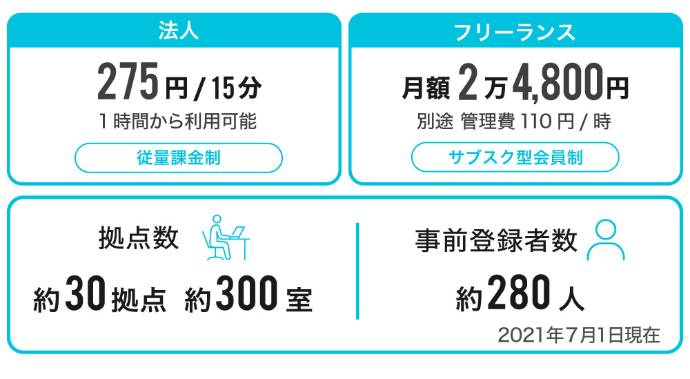 フリーランス向けには、月額サブスクリプションプラン(以下、サブスク)、法人向けには従量課金プランの「テレスペセカンドハウス」を2021年4月に発表しました。プレスリリースを1枚出しただけの報告でしたが、SNSを中心に話題を集め、口コミだけで280人以上の事前登録が確保できました。