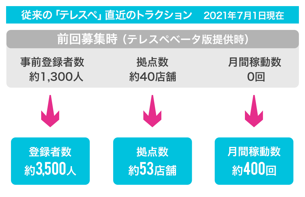 一方で、創業のキッカケとなった2019年末当時と現在は環境が異なります。 ローンチ後2ヶ月半経過の3月末日で月間トランザクション400回を超えるなど、順調に成長した「テレスペ」ですが、コロナ禍でカフェがテイクアウト専門になり、カラオケが営業を停止し、打ち合わせがビデオツールになる中では、今後、計画通りの成長は望めないと判断しました。