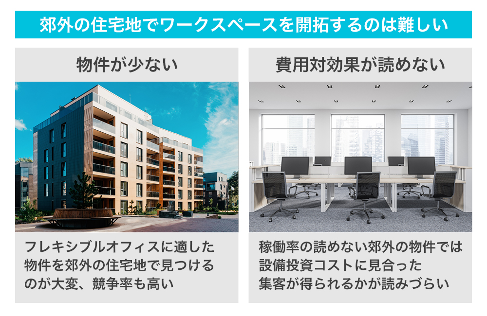 都心と異なり、郊外の住宅地ではオフィス用途の大きなビル自体が少ないことや、シェアオフィスにするためにはビルオーナーの許可が必要となるため、簡単には開発できません。その他にも、管理コストや設備投資や人件費など多くのコストがかかるため、不動産会社各社は、稼働率の読めない郊外では簡単にシェアオフィスを開拓できないのです。