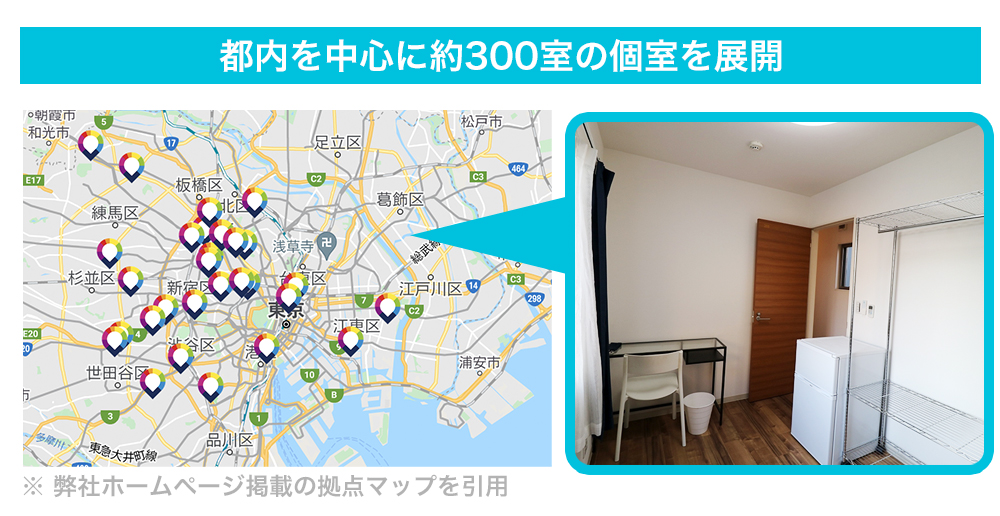 約3ヶ月の準備期間で都内に約300部屋の個室を確保し、6月8日にベータ版としてサービスを開始しました。