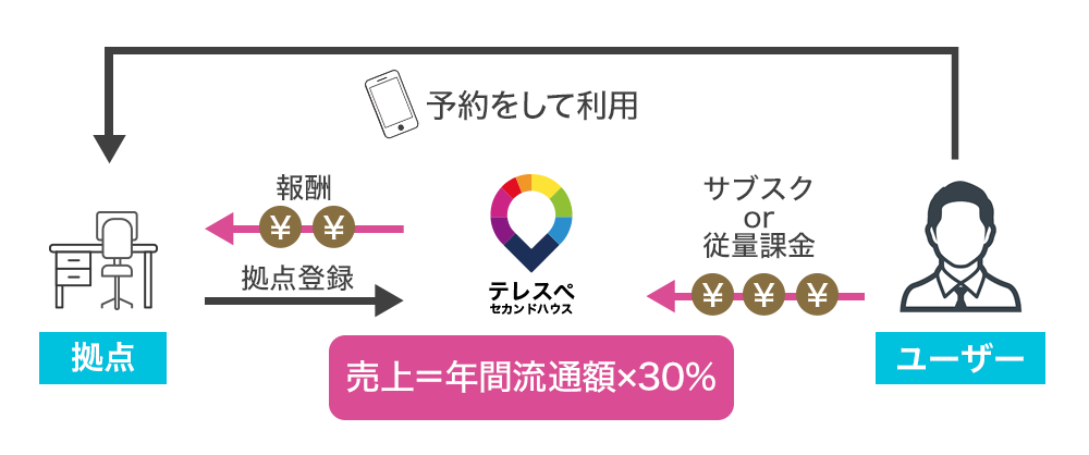 大手民泊サービスのように、当社は提供者と利用者のマッチングを行うビジネスモデルなので、双方の流通額の30%が弊社の売上となる仕組みです。