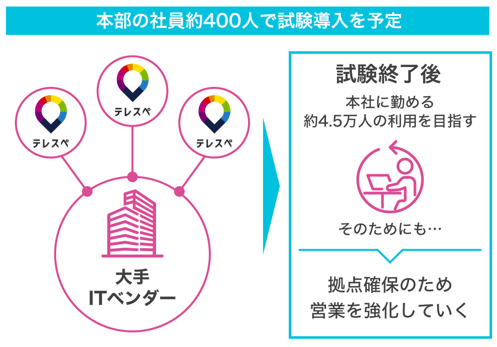 現在、業界最大手の某ITベンダーと「テレスペセカンドハウスプラン」の実証試験を準備中です。7月中旬ごろから稼働の予定で、短期的なゴールは本社の社員さんの1%の約400人が週に1回利用できるようにすること。最終的なゴールは、本社の全社員さん約4.5万人が好きなときに「テレスペセカンドハウス」を簡単に利用できることを目指します。