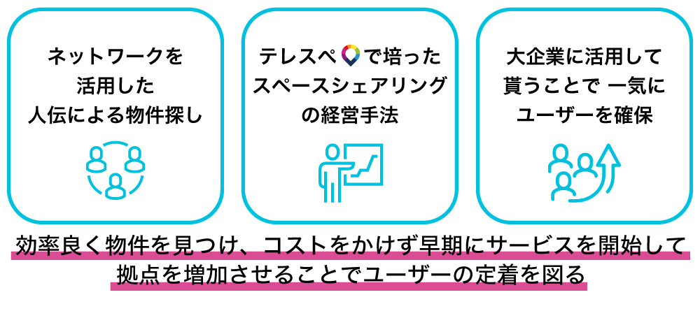 マンションやテナントの一室を当社が新たに契約して事業展開するのではなく、個室を提供したい人と利用したい人をマッチングすることで効率的にスペースを確保していきます。