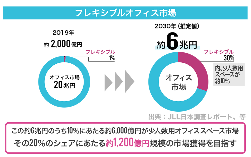 シェアオフィスなどのフレキシブルオフィス市場は2019年にオフィス全体の1%だったものが、2030年までにオフィス全体の約30%(約6兆円)にまで成長すると言われています(出典:JLL日本調査レポート)。