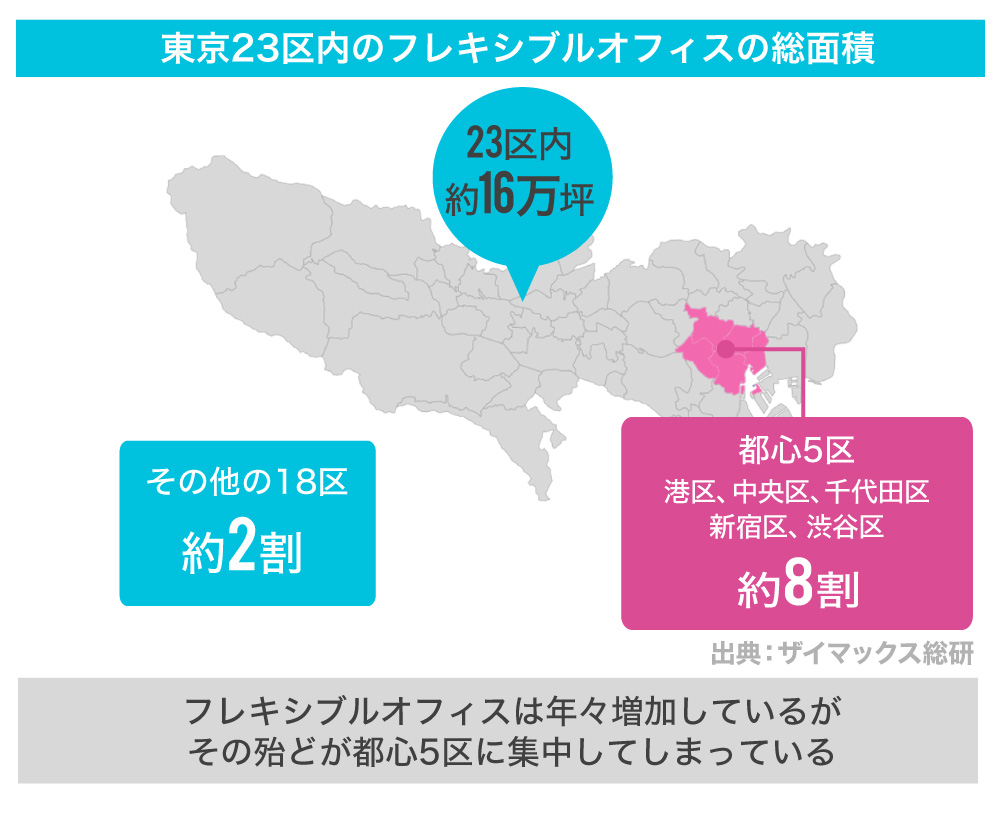 それに伴い、働き方がますます多様化するなかで新たな悩みが増えています。それは、「働く場所の確保」です。コワーキングスペースやシェアオフィスなどの、いわゆる「フレキシブルオフィス」の数は年々増加傾向にありますが、東京23区内のフレキシブルオフィスのうち8割弱が都心5区に集中しているというデータがあります(出典:ザイマックス総研)。