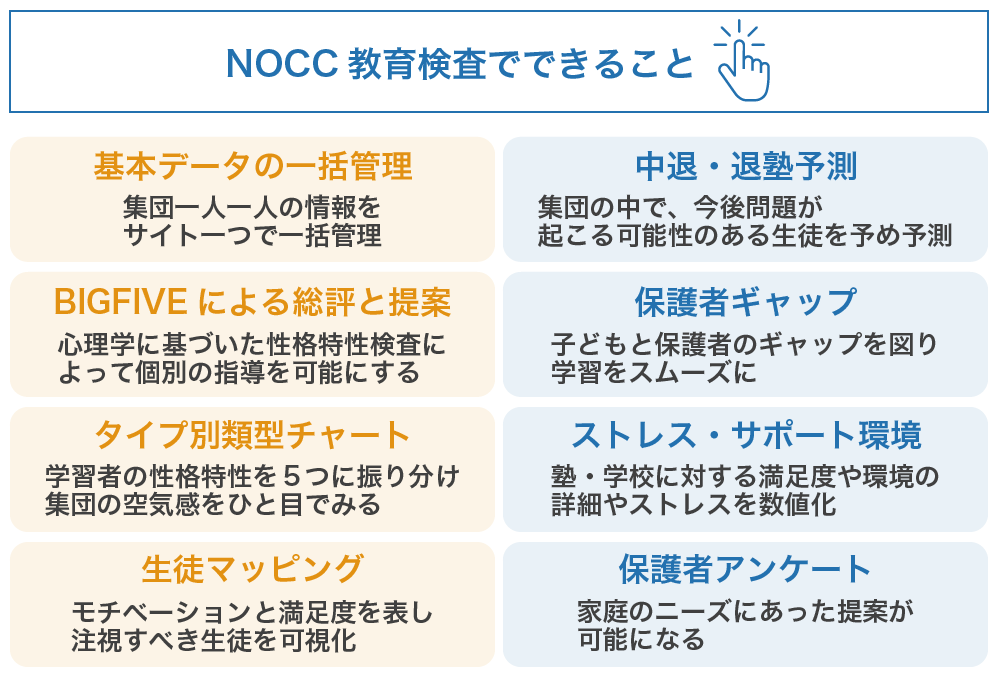 「NOCC教育検査」は心理学と人工知能学の教授による監修の下、「認知能力や被認知能力」「ストレス状態」などを測定し、「成績の伸びやすさ」「退塾・中退」などを予測することができるサービスです。すでに174の教育機関に導入され、受検者数も5万人を突破しました。弊社は、これまで見えてこなかった生徒と保護者のニーズや満足度を見える化し、どの先生も個別最適な指導ができるようにサポートしていきます。