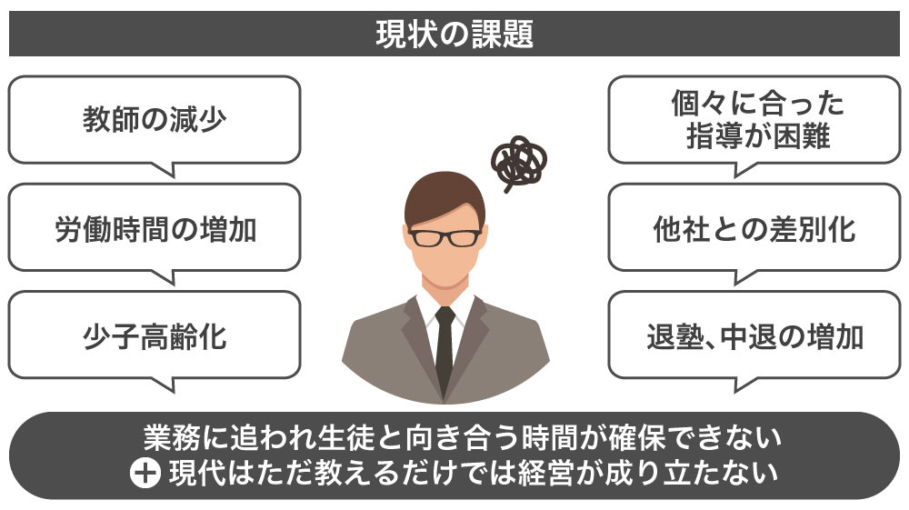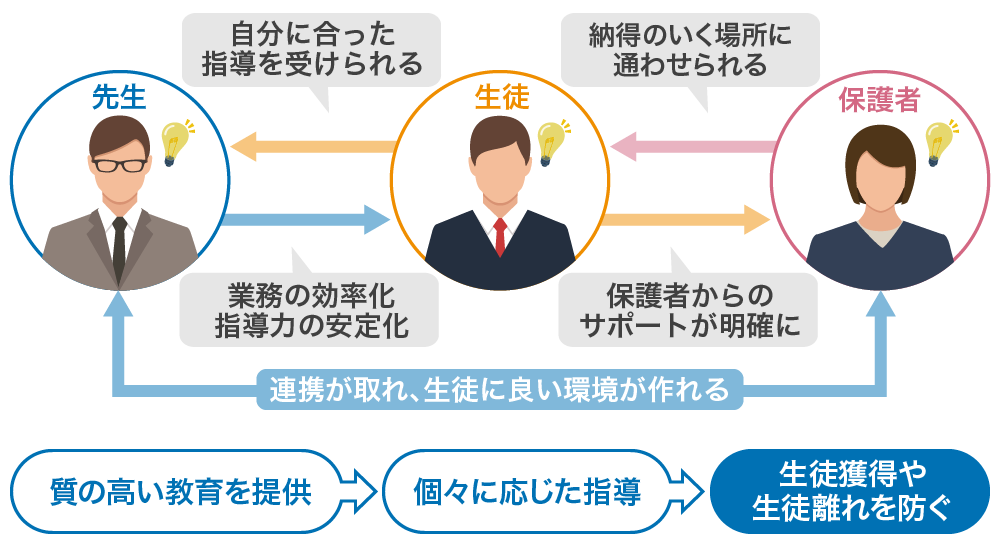 自校が選ばれやすくなるために、学習者である生徒の確保と定着が求められており、「いかにして生徒を志望校へ合格させるか」を目標に掲げています。また、それだけでは十分ではなく、保護者の満足度まで考慮して経営を行う必要があります。