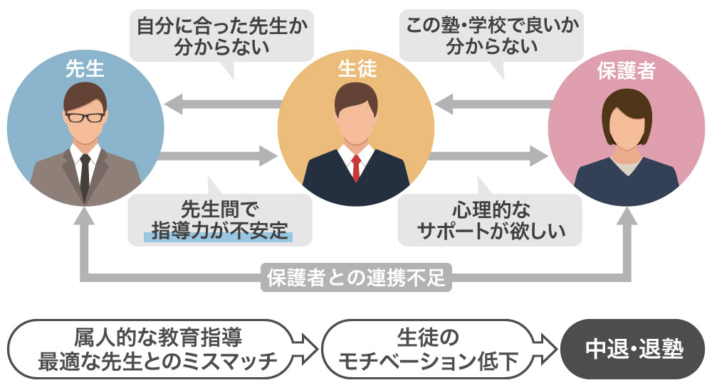 しかし、生徒からすると「良い先生との出会い」次第という側面が教育機関を選ぶポイントとして非常に強いです。志望校への合格も、勉強が楽しくなることも、教える側の経験や知識に依存している場合が多く、それらが不足していると、生徒の退学や退塾へと繋がってしまうという課題もあります。
