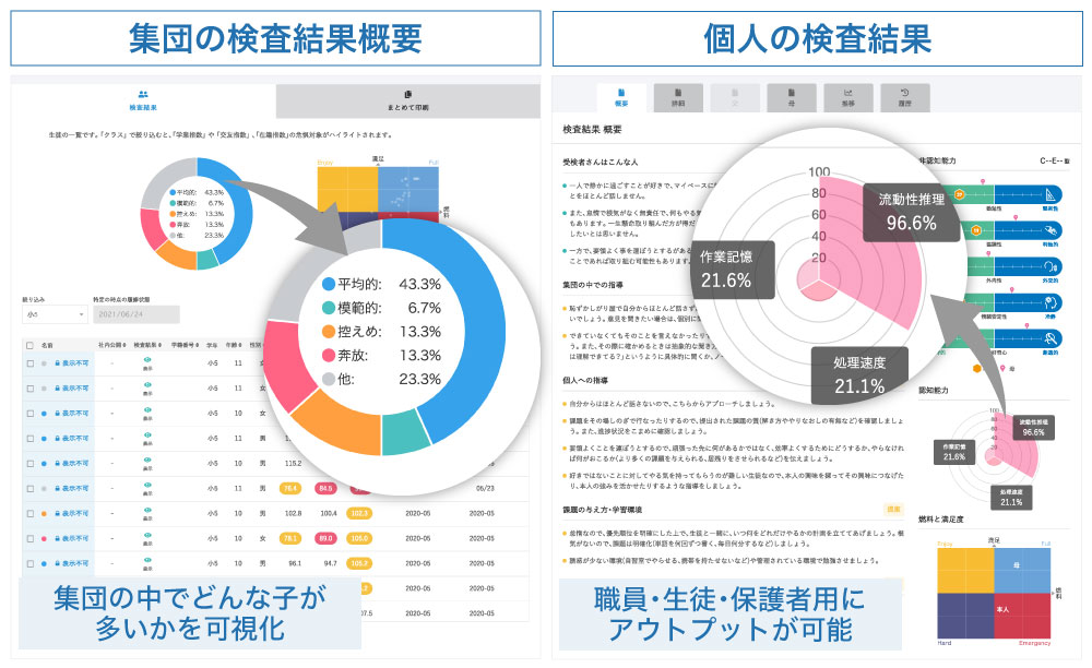 これまでの学習や教育は、教える側の経験や知識、すなわち直感で学習の成否が決まってしまう側面が強くありました。弊社はこうした状況を変えるべく、学習者である生徒の能力や特性を心の状態を含め科学的に測ることで、個々に合った指導を提案する「NOCC教育検査」を教育機関に提供しています。