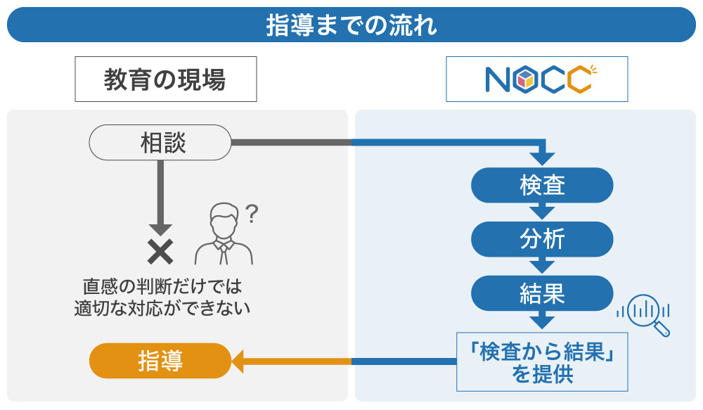 これまでは教育する側の経験や知識などによる「直感」で行われてきた教育現場に対して、「NOCC」は最新の心理学理論を導入し、生徒や保護者の心理的状況までを可視化していきます。これにより、教える側の経験や知識に依存することなく、生徒や保護者、そして指導者が抱えている課題を可視化していきます。
