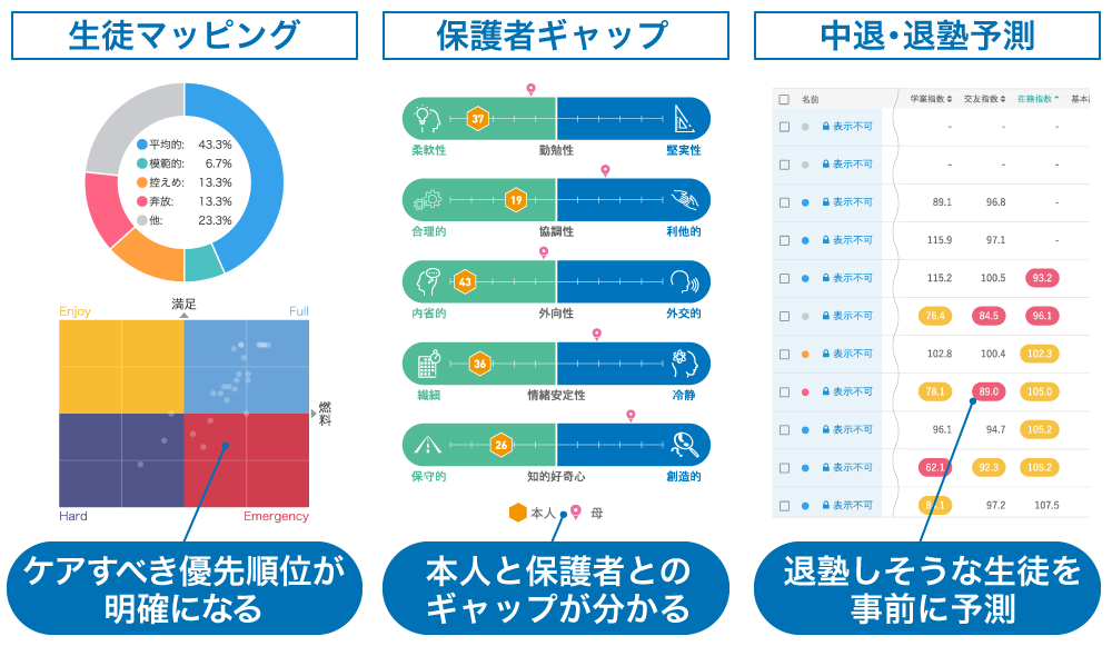 具体的には、認知能力や非認知能力などを科学的に測定する「NOCC教育検査」を生徒や保護者に受けてもらいます(検査は無料)。そして、検査結果を「生徒マッピング」「保護者ギャップ」「中退・退塾予測」といった機能で見ることにより、先生たちは誰にどのようなアプローチをすれば良いのかがわかります。