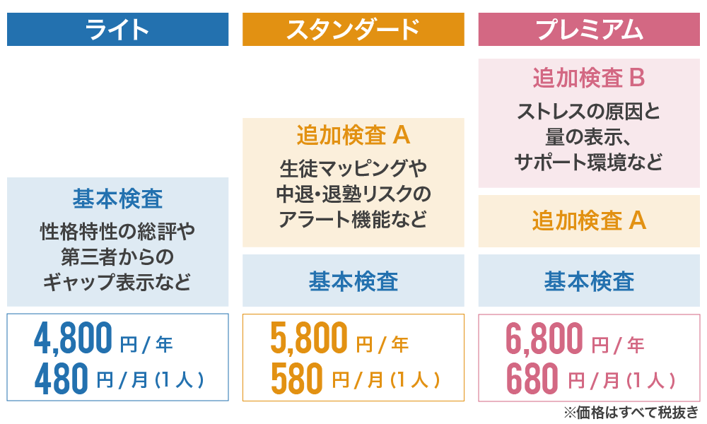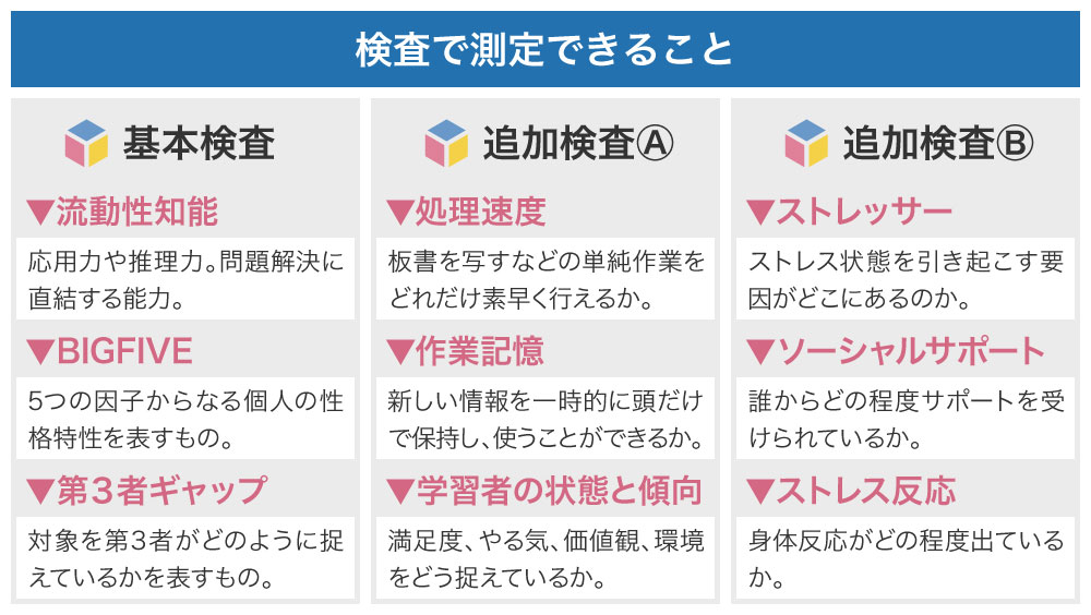 追加検査Aでは生徒の教育機関への満足度等を、追加検査Bでは生徒のストレス状態をそれぞれ測定します。生徒の心のコンディションを適切に把握することで、「NOCC」は教える側に対して効果的な指導法や接し方などを提案していきます。