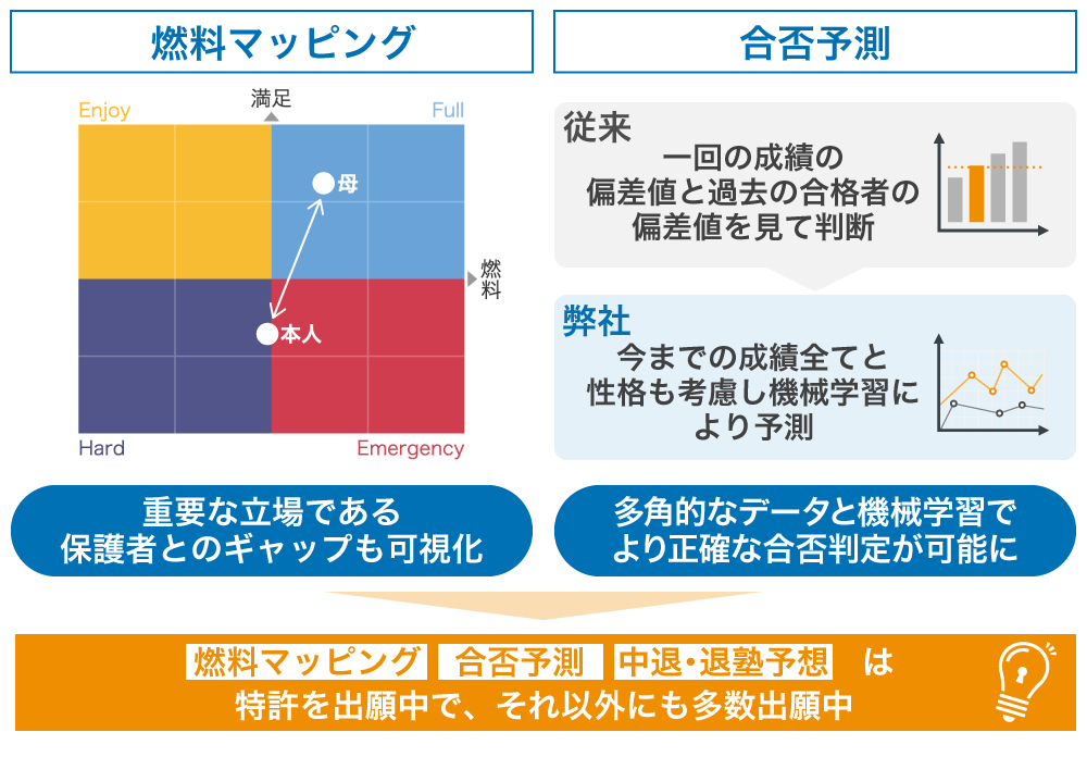 また、新機能として、弊社は新たに「保護者版の燃料(やる気)マッピング機能」を開発しました。これは、教育機関に対する保護者の満足度や、子どもの成績及び進路に対する保護者のモチベーションを科学的に測定できる機能です。さらに、今夏には「合否予測」機能もリリースする計画で、教育に関するあらゆるデータを測定し、それらを活用できるように開発を進めています。