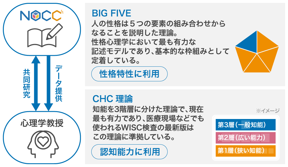 「NOCC」は、性格特性であれば「Five factor理論(ビッグファイブ) 」、IQ等の認知能力の把握に関しては「CHC理論」など、心理学の主流となっている指標を用いて測定することが可能です。