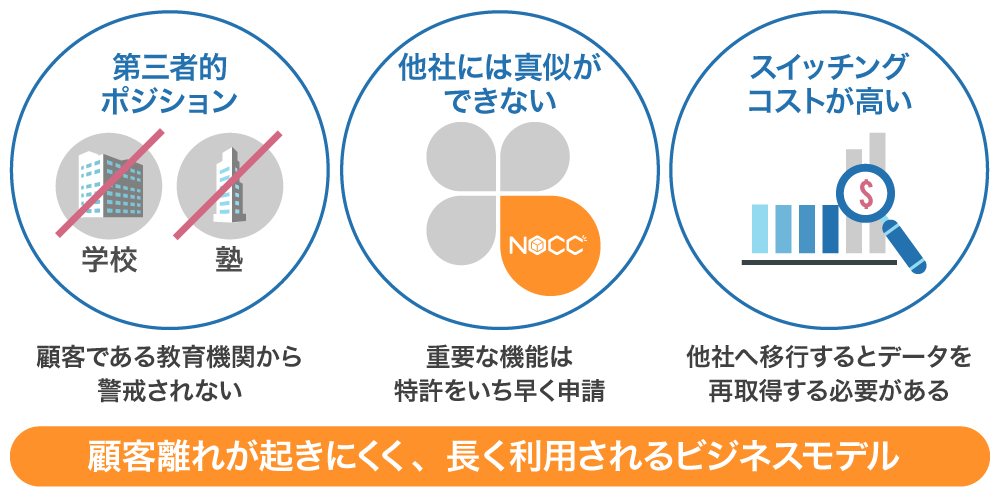 弊社のビジネスモデルは「NOCC」導入の教育機関が増加すれば生徒の離脱も起きずらく、さらにはデータも蓄積でき、新機能の開発が進むといった先行者利益を享受しやすい仕組みとなっています。