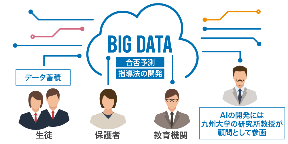 株式会社トワールでは、生徒の学習過程において取得されるビッグデータを、統計やAIを駆使して解析し、各生徒の進路に必要となる“客観的“な情報を提供するシステムを構築し提供します。