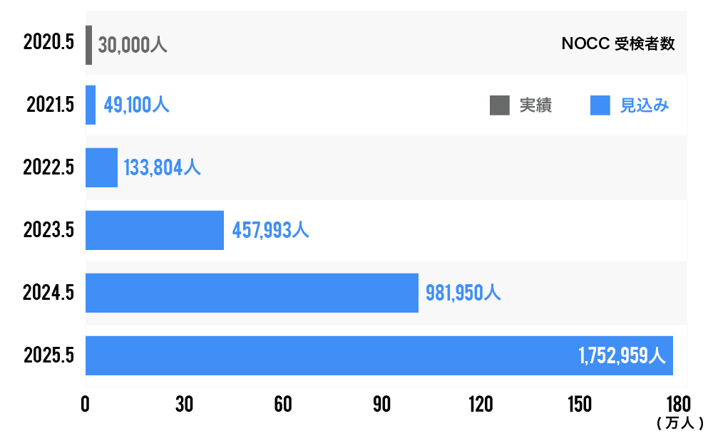 また、関西に複数校を展開するひのき塾や岡山理科大学など、174の教育機関にすでに導入されています。「NOCC教育検査」に関しては、教育機関を介して約5万人が受検しており、公立学校や私立学校にも導入が進んでいます。