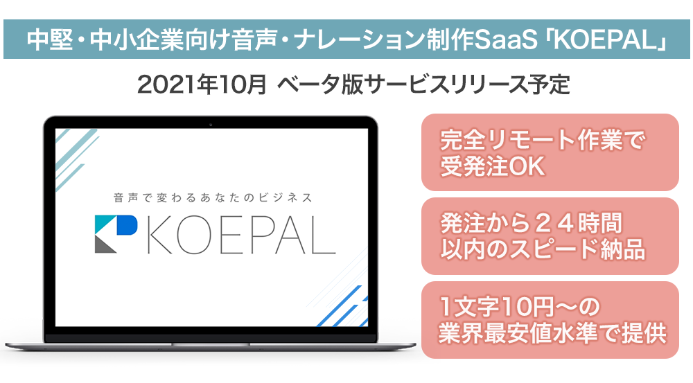 弊社は、2017年に創業して以来、キャラクター商品の制作や、販売促進プロモーション、WEB・アプリ開発、動画制作、国内外のEC運営などを主軸に事業を展開してきました。そして、この度、新たにオンラインで「音声コンテンツ」を受発注できるSaaS型サービス「KOEPAL(コエパル)」を2021年10月にリリースする予定です。