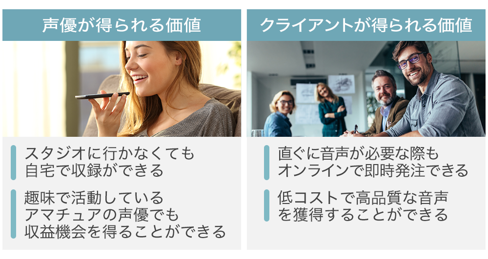 もっと、様々なニーズに対応した音声・ナレーションを、誰もが手軽にオファーでき、簡単に収録できて直ぐにチェックできる、そんな「音声・ナレーション専用」の受発注サービスがあれば、もっと多くの声優にチャンスが訪れ、音声ビジネスがより活性化していくのではないかと考えています。