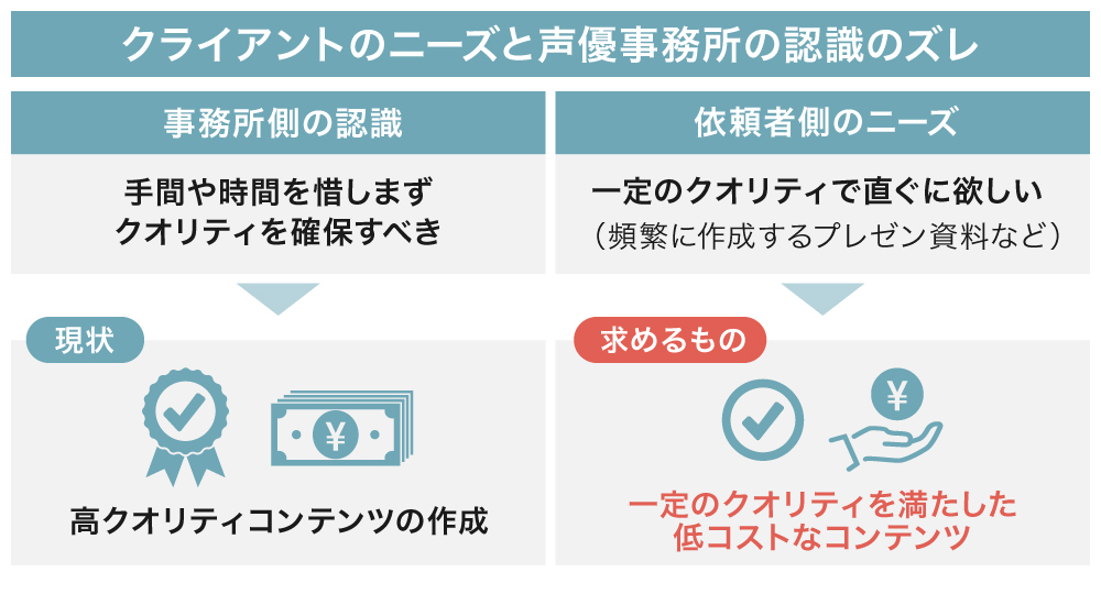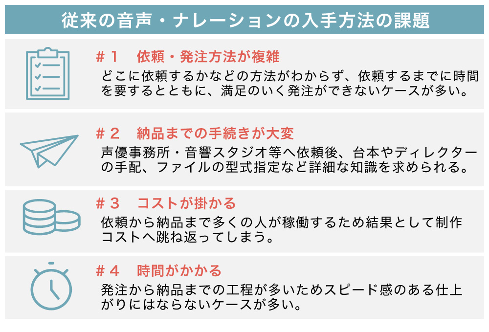 一方で、急速な需要拡大の裏では、課題も表面化しています。それは、音声またはナレーションを手軽に依頼できる環境が整備されていない点です。