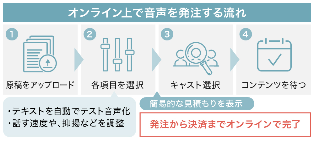 声優に依頼する前に、テキストを自動でテスト音声化する機能も備える予定であり、依頼主はその音声をチェックしながら話す速度や、抑揚などを調整できます。