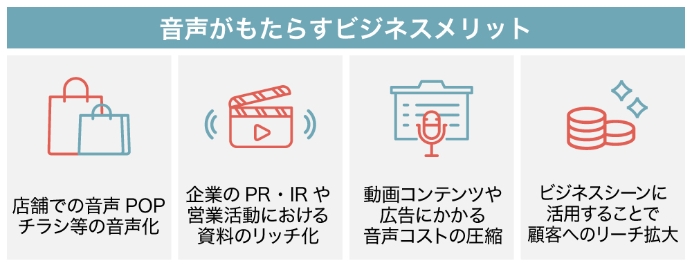 アニメや映画、TVCMのような高い品質を求めるコンテンツであれば、これらの手間や時間は惜しむものではないと思います。しかし、頻繁に作成するプレゼン資料や、音声コンテンツなど、ある一定のクオリティがあれば差し支えないコンテンツに関しては、一流の声優を活用した、高クオリティなコンテンツを、コストをかけて作成するのはニーズに沿わない場合もあると思います。