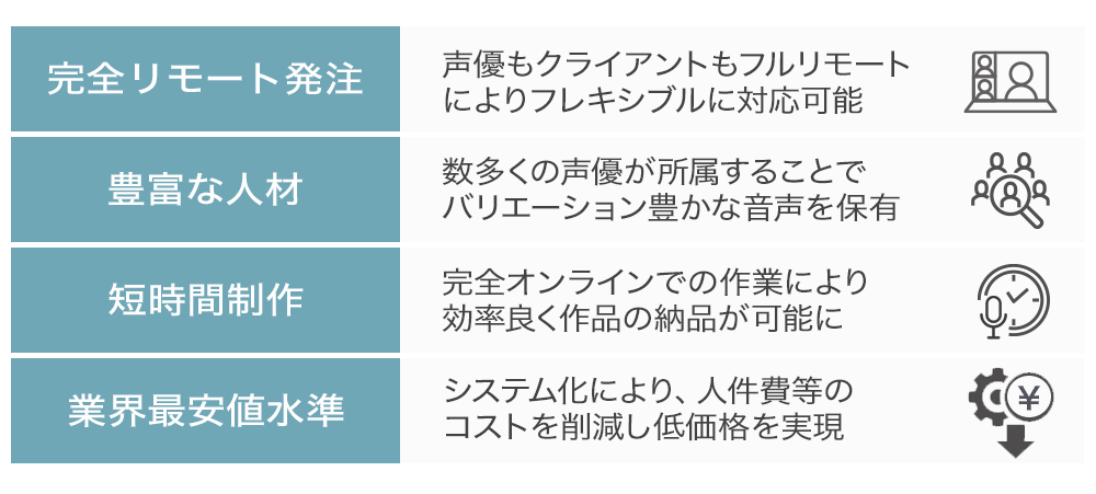 このように、すべての手順をオンライン上で完結にすることと、数多くの声優を確保することで、これまで必要とされた工数・時間・コストを大幅に圧縮することが可能になると考えています。