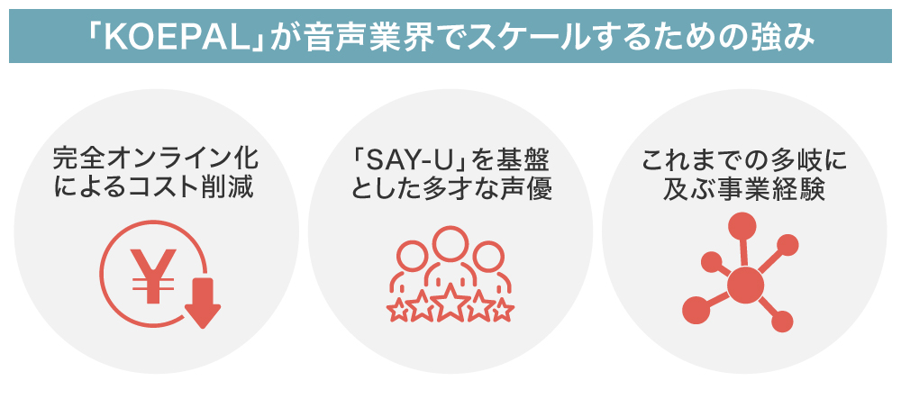 また、弊社では「KOEPAL」の他にも、既存の「SAY-U」や、キャラクター商品事業や販促プロモーション事業など、多岐にわたる収益機会を有していますので、「KOEPAL」が軌道にのるまでの準備期間中も安定的なマネタイズを行っていくことができます。