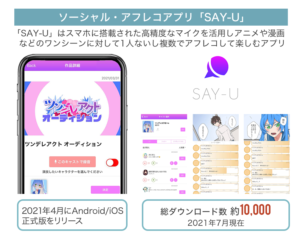 「SAY-U」は、スマホに搭載された高精度なマイクを活用し、アニメや漫画などのワンシーンに対して1人ないし複数でアフレコして楽しむアプリです。