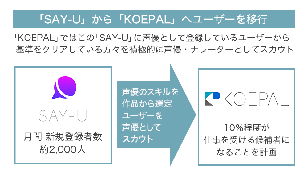 「KOEPAL」では、この「SAY-U」に声優として登録しているユーザーから、弊社が設けた基準をクリアしている方々を積極的に「KOEPAL」で活躍する声優としてスカウトしていく計画です。