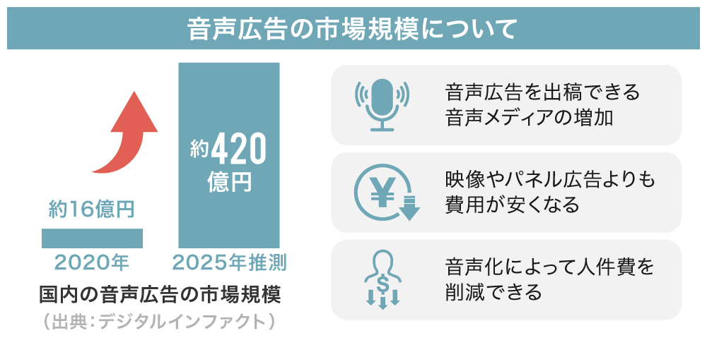 国内の音声広告の市場規模は、2019年に約7億円だったのが、2020年時点で約16億円にまで成長、さらに2025年には約420億円にまで増加すると予想されています(出典:デジタルインファクト)。