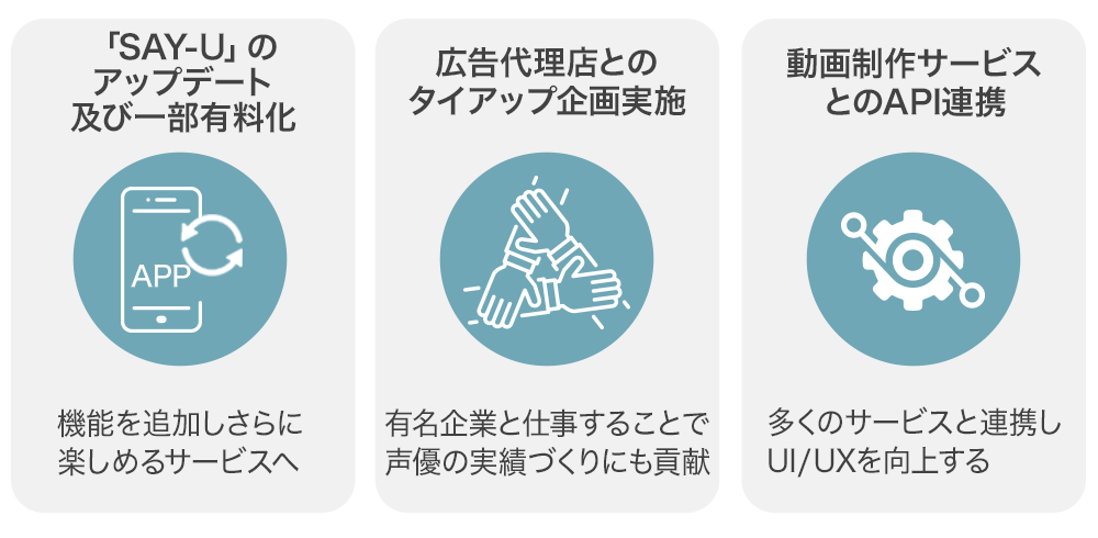 また、「SAY-U」においても、登録者を増加させるために、自らがアフレコした作品のダウンロードを可能にする機能や、有名企業とのタイアップ企画を実施するなどのプロモーションを行い、ユーザーを増やしていく計画です。