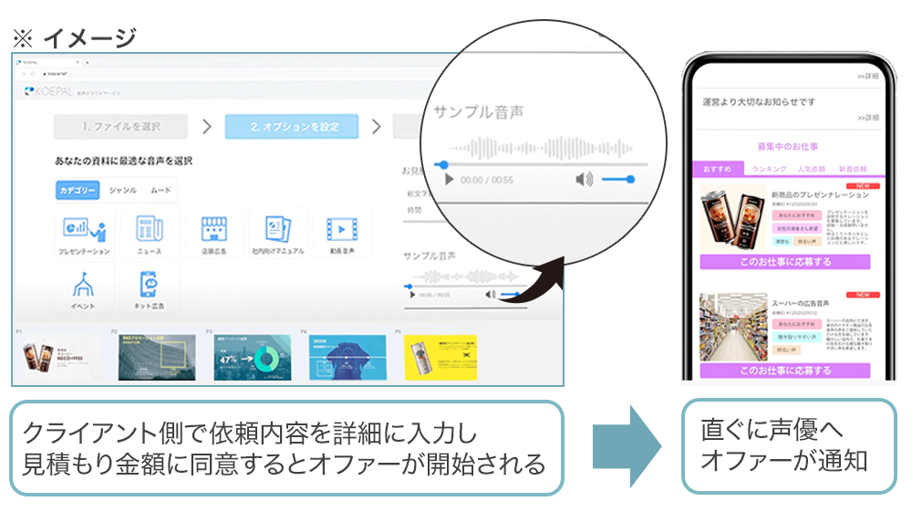 クライアントからの依頼を基に、「KOEPAL」から所属する声優にオファーが届きます。案件を受注した声優は自宅でアプリ(スマホ)を使用してすぐに収録できる仕組みになっています。