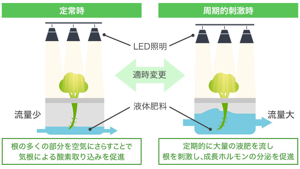 もう一つは、「アグロファクター」の最大の特徴でもある、「周期的刺激」という栽培方法です。普段は液体肥料の量を少なくして敢えて飢餓状態にし、その分定期的に液体肥料を沢山流して根に刺激を与えることで、成長ホルモンの分泌を早めさせる方法です。この方法により一般的な水耕栽培よりも約2倍も大きい野菜を短期間で収穫ができるようになりました。