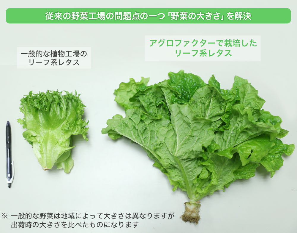 従来の植物工場の野菜はスーパー等で多く見かけることができますが、露地野菜に比べ小さくて高価なため、消費者から敬遠されることが多いのです。