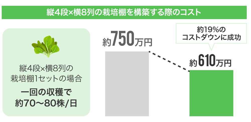 特筆すべき点は、栽培棚建設費のコストダウンです。これまで、縦4段・横8列の栽培棚を建設するのに、ICTなどの設備も全て揃えて約750万円を要していたのが、効率化により約610万円にまで下げることができました。