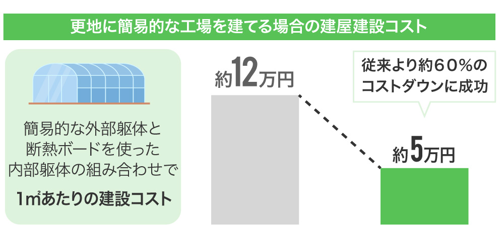 これに対し、極めて簡易的な外部躯体と、断熱ボードを使った内部躯体を組み合わせることで1㎡あたりの建設コストを約5万円と約60%ものコストダウンを実現することができました。さらに栽培棚のコストダウンと合わせ、植物工場の建設に必要な初期投資を大きく抑えることが可能になりました。