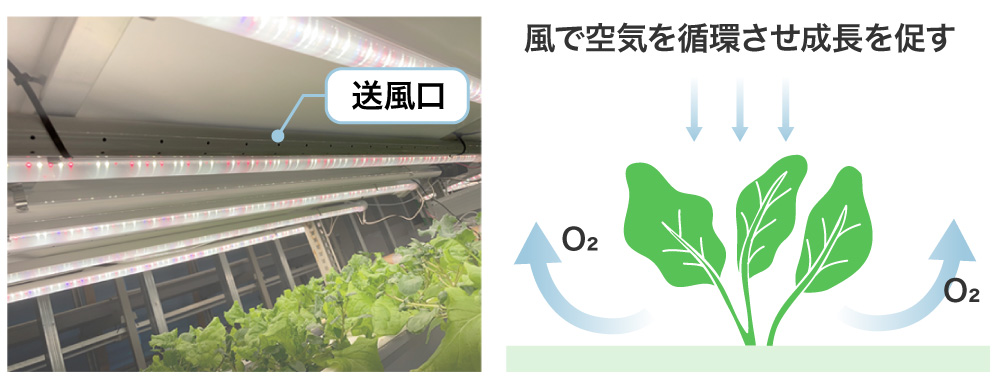 野菜の成長には、「栄養」「光」そして「風」が欠かせません。野菜は光合成により酸素を放出します。この、酸素が野菜に滞留しないよう、風で栽培棚の空気を巡回させます。