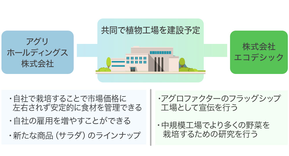同社と共同で工場を建て、弊社が管理し、収穫した野菜は両社で活用する計画です。野菜を自社で育てたいがまだ栽培には自信が持てないという同社の要望と、自社工場を確立したいと考える弊社の要望が合致しました。