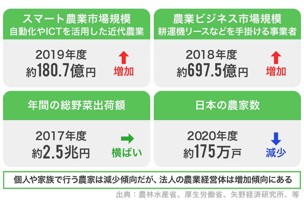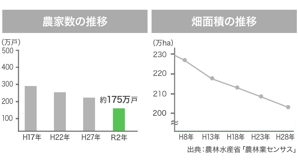 昨今の気象変動や、後継者不足などを起因として、日本での農家数は減少傾向にあります(出典:農林水産省)。特に、露地栽培やビニールハウス栽培は自然災害の影響を受けやすく、収穫が保証されないことや、自身で作った野菜の販売価格を自身で決められないなどの障壁が多く、収入を安定させるのが難しい現状があります。