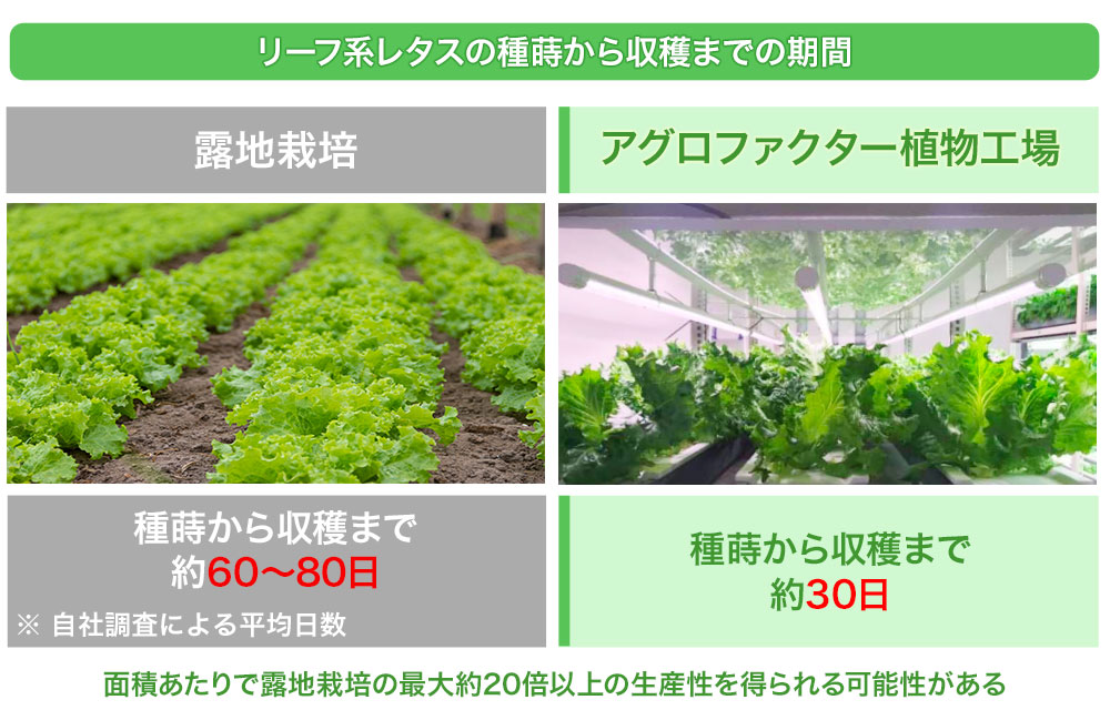 「アグロファクター」によるリーフ系レタスの栽培を例にとれば、露地栽培と比べて栽培期間を2/3〜半分まで短縮することができます(自社調べによる)。これにより、同じ農地面積でも多段方式を採用すれば、1年間の生産量を最大約20倍まで増やすことが可能にできると考えています。