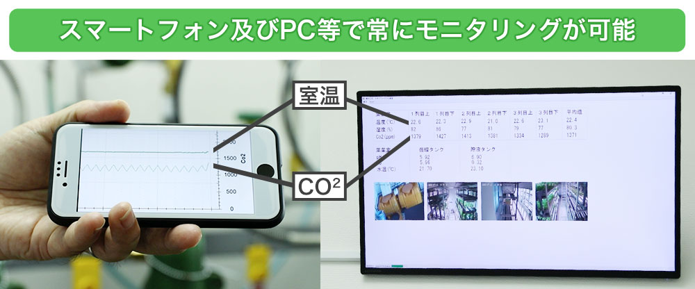 また、栽培をいつでも管理できるよう、スマートフォンやパソコンで栽培室の気温や二酸化炭素濃度、成長具合などを画像と数値でリアルタイムに確認できるスマート農業の仕組みも構築済みです。