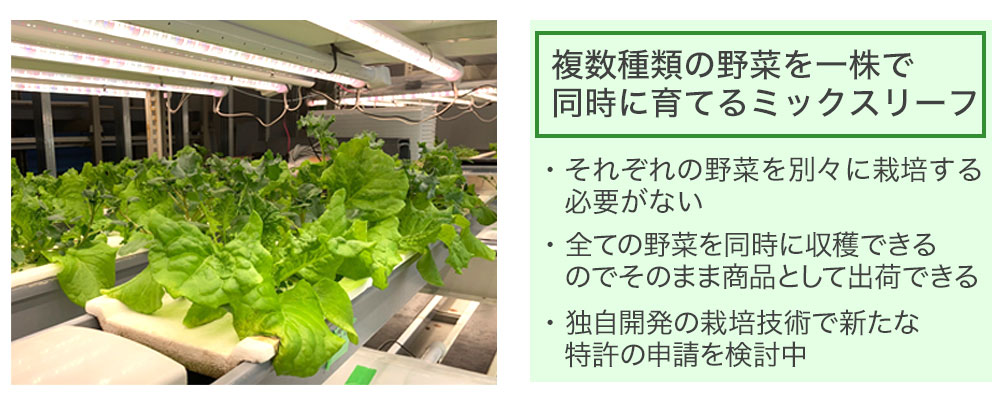 種を植える時期や栄養の与え方を微調整することで、複数の野菜を同時収穫できるようになりました。収穫した「ミックスリーフ」はそのまま販売でき、購入した方はそのまま「ミックスサラダ」として食べていただけます。弊社はこの独自の栽培方法で特許の申請も視野に入れています。