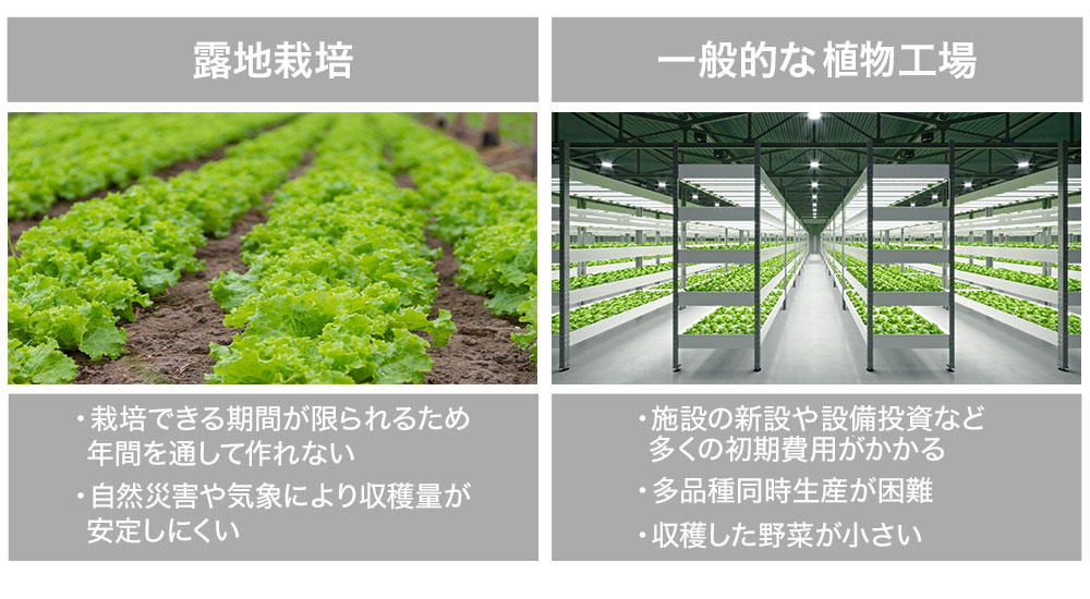 現在の植物工場の設備投資が高額であることや、野菜が大きく育ちにくいこと、その他に肥料や水分などの消耗品コストがかさんでしまうことで、露地野菜との価格の競合に対して優位性を持てず、うまく収益化できないのです。